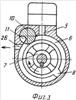 Таким образом, за каждые два оборота ротора 7 и эксцентрика 22 полости 12 и 13 в диске 3 поочередно соединяются вначале с каналом 4 компрессорной секции и выполняют роль камеры сжатия, затем занимают промежуточное положение, показанное на фиг.5, и выполняют роль камеры сгорания и затем соединяются с каналом 5 рабочей секции и выполняют роль камеры расширения.