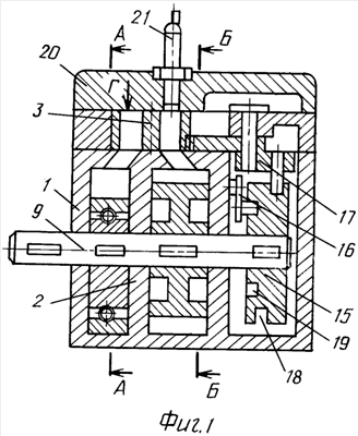 Корпус 1 двигателя разделен перегородкой 2 на две секции: компрессорную и рабочую. Имеющиеся в диске 3 полости могут быть соединены с компрессорной секцией каналом 4. Корпус 1 в рабочей секции имеет цилиндрическую полость 6, в которой установлен цилиндрический ротор 7, имеющий выступ 8. Ротор 7 жестко закреплен на валу 9 двигателя и кинематически связан с заслонкой 10, которая размещена в отверстии корпуса 1. В теле заслонки 10 для прохода выступа 8 ротора 7 выполнен паз 11. Полости 12 и 13 в диске 3 отделены одна от другой перегородкой 14, проходящей по центру диска 3 вдоль его продольной оси. Привод диска 3 кинематически связан с ротором 7 так, что каждая из полостей 12 и 13 поочередно соединяются вначале с каналом 4 компрессорной секции и выполняют при этом роль камеры сжатия, затем занимают промежуточное положение и выполняют роль камеры сгорания, затем соединяются с каналом 5 рабочей секции и выполняют вместе с ней роль камеры расширения. Такая кинематическая связь может быть осуществлена, например, с помощью кулачкового барабана 15, закрепленного на валу двигателя 9 и воздействующего соответствующими кулачковыми пазами на рычаг 16 и рычаг – зубчатый сектор 17, жестко связанных соответственно с заслонкой 10 и диском 3. Кулачковый паз 18 барабана 15 предназначен для периодического поворота и установки диска 3 в положения, показанные на фиг.4, 5, 6, а кулачковый паз 19 предназначен для периодического поворота заслонки 10 в момент пропуска выступа 8 ротора 7 при каждом обороте последнего. В крышке 20 над каждой полостью диска 3 установлены свечи зажигания 21 (карбюраторный вариант двигателя) или форсунки для впрыска топлива в одну из полостей в диске 3. Системы питания смазки и охлаждения двигателя условно не показаны.