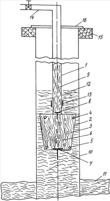 С началом отбора нефти из скважины начинается и поступление нефти из продуктивного пласта 11, а в межтрубном пространстве устанавливается динамический уровень нефти (не показан).
