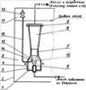 При работе инжектора 1 в камере смешения 3 образуется наружный вихревой слой вокруг струи масла повышенного давления, выходящей из сопла 6. Область смешения масла повышенного давления и инжектируемого масла зарождается вблизи выходной кромки сопла 6. В области смешения происходит интенсивное вихреобразование, в результате воздействия которого граничный слой струи начинает увлекать медленно движущиеся слои окружающего масла, подтягиваемого через окна 4 из масляной полости 5 маслобака 2. Скорость движения слоев струи намного превышает скорость окружающего масла. Создающийся турбулентный слой, обладающий большой энергией, резко выхватывает и увлекает соседние, медленно подходящие слои со столь значительной скоростью, что вдоль границы смешения происходит уменьшение давления до критического – образуется область пониженного давления 12 – с образованием пузырьков, заполненных паром и газом. При этом на поверхности взаимодействия потоков с разными скоростями образуется срывная кавитация, причиной которой являются свободные вихри и начинается она не при давлении парообразования в масле, а значительно его превышающем, в механической смеси в виде пузырей, расширяющихся при любом понижении давления. С удалением от сопла увеличивается расход масла в струйном пограничном слое за счет вовлечения окружающего масла. Образующиеся каверны уносятся потоком в конфузор 15 и далее в горловину 7. Внутренняя часть струи непрерывно утоняется. В месте, где пограничный слой соприкасается со стенками конфузора 15 или горловины 7, заканчивается процесс вовлечения. Здесь же начинается преобразование кинетической энергии в статическое давление, с ростом которого большая часть каверн, внесенных потоком, заканчивает свое существование – пузырьки охлопываются до микроскопического размера. Меньшая их часть, транспортируемая потоком, исчезает в диффузоре 8. Процесс сопровождается высокочастотными гидравлическими микроударами и высокими местными забросами давления. “Схлопывание” даже при весьма умеренном гидростатическом давлении происходит очень резко и образуется сильная волна разрежения, за который следует волна сжатия. Развившейся кавитации всегда сопутствуют звуковые колебания, воспринимаемые как кавитационный шум. Образование пузырьков паровой и газовой кавитации в зонах пониженного давления при высоких скоростях присуще явлению развитой турбулентности, полезно используемой в инжекторе, и не является недостатком его конструкции. Уровень кавитации в инжекторе определяется величинами давления масла, подводимого к соплу, и давления в камере смешения, количеством воздуха, растворенного в масле. Воздух из воздушной полости 11 с атмосферным давлением поступает в область пониженного давления 12 через дроссель 13 по трубе 10 и выходит в рабочий поток через отверстие на конце 14 трубки 10, загнутой по потоку в сторону конфузора 15, перемешиваясь с парогазовыми пузырями, при схлопывании которых в зоне горловины 7 и диффузора 8 создает демпфирующий эффект, гася колебания. Дросселем 13 подбирается количество поступающего по трубке 10 воздуха, необходимое для эффективного демпфирования и одновременно для поддержания работоспособного состояния масла. Из диффузора 8 через патрубок 9 масло необходимых параметров поступает к потребителю в 
