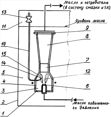 На чертеже схематично представлен масляный инжектор, установленный в маслобаке под уровнем масла.