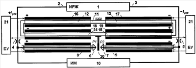 Источник 1 рабочей жидкости через дифференциальные линии 2, 3 подвода рабочей жидкости с дросселями 4, 5 подключен к дифференциальным магнитострикционным трубочным соплам 6, 7 с однотипными обмотками и противофазным выводам ИМ 10. Между соплами 6, 7 размещена заслонка 20, которая жестко закреплена посередине одной из ветвей O-образного магнитострикционного привода 11. На его плечах 12-15, образованных параллельными ветвями, по всей длине размещены однотипные обмотки 16-19. При этом обмотки 8, 9 и 16-19 сопел и привода 11 попарно объединены и полярно подключены к первым и вторым противофазным выводам БУ 21 соответственно.
