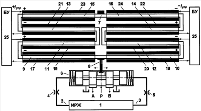 Управление исполнительным устройством в заданном диапазоне перемещений осуществляется путем однозначного изменения паритета рабочих давлений Р1 Р2 по линиям А и В посредством золотникового устройства 6. Это достигается подачей на полярные (дифференциальные) обмотки 17, 20, 21, 24 и 18, 19, 22, 23 управляющие токовые сигналы Iупр=IO с противофазных выводов БУ 25 соответственно: I17,20,21,24=IO±Iупр и I18,19,22,23=IO Iупр. В результате удлинения дифференциальных ПП-образных плеч 9-16, число N которых является четной величиной и выбирается исходя из требуемых диапазона линейного перемещения штока золотникового устройства 6 и жесткости плеч 9-16 привода 7, соответственно: L9,11=L9-L11=(LO L)-(LO± L)= 2· L, L13,15=L13-L15=(LO L)-(LO± L)= 2· L, откуда L9,11,13,15=L9,11+L13,15=±4· L, и аналогично L10,12,14,16= 4· L, поводок 8 и золотниковое устройство 6 будут полярно перемещены на величину l6,8=±N· L, здесь N=4, и в соответствующее число раз в его камерах будет перераспределено рабочее давление линии Р напора.