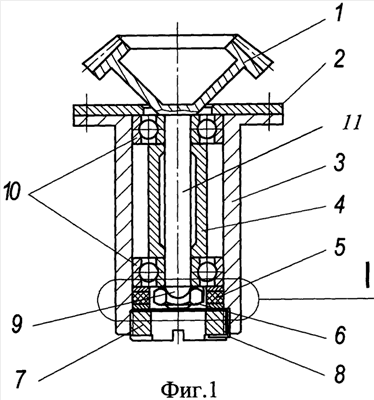Сущность изобретения поясняется чертежом, где на фиг.1 изображено устройство в сборе, на фиг.2 – элемент I с упругим кольцом. Предлагаемая конструкция содержит коническое зубчатое колесо 1, прижимающее плоское кольцо 2, корпус подшипников 3, распорную втулку 4, осевой упругий демпфер 5. Демпфер 5 включает кольцевой упругий элемент, размещенный между двумя металлическими кольцами 13 и прикрепленный к ним (приклеен или привулканизирован). Внутренняя гайка 6 стягивает внутренний пакет, содержащий втулку 4 и внутренние обоймы подшипников 10. Наружная гайка 7 стягивает наружные обоймы подшипников 10 через упругий демпфер 5. Гайки 6 и 7 контрятся от отворачивания контровочными замками 8 и 9. При этом боковые поверхности 12 упругого кольца демпфера 5 выполнены вогнутыми по кривой второго порядка для снижения напряжений на наружных поверхностях резины. При сборке узла на ось 11 конического зубчатого колеса 1 надеваются: кольцо 2, подшипники 10 с распорной втулкой 4 и набор стягивается внутренней гайкой 6, которая контрится замком 9. Этот собранный узел вставляют (запрессовывают) в корпус подшипников 3, прикрепляют к нему кольцо 2 и с противоположной стороны вставляют упругий демпфер 5, контровочный замок 8 и прижимают весь набор наружной гайкой 7 с усилием, в 1,5-2 раза превышающим рабочее осевое усилие, действующее на коническое зубчатое колесо. Гайку 7 контрят замком 8.
