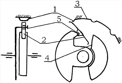 В процессе работы кулачок-толкатель 3 поворачивается на оси 5 при скольжении и взаимодействии с неподвижным кулачком 1 и изменяет положение вала при скольжении в кинематической паре 4. На валу рабочего органа суммируются равномерное вращение и колебательное вращательное движение.