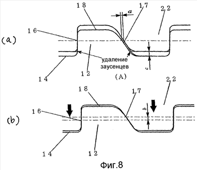 Однако согласно патентному документу 3 необходимо производить обжим на значительной длине конца трубы (вероятно, 100-200 мм), поэтому требуется горизонтальный прокатный стан чрезвычайно высокой мощности и обжимной штамп быстро изнашивается, поэтому возникает довольно острая проблема производственных издержек. Кроме того, внутренний диаметр соединения существенно уменьшается, что создает высокую турбулентность во внутренних текучих средах, проходящих через участок соединения, которая становится ощутимой и может вызвать эрозию. Кроме того, в случае нефтяных бурильных труб уменьшается размер трубы, которую можно вставить внутрь, поэтому конструкция колонны становится очень малоэффективной.