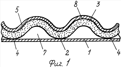 Изготавливаться заявляемый материал может следующим образом. На первом плоском стекловолоконном листе размещается базальтовый мат, которому предварительно придана гофрированная форма. На противоположной стороне мата размещается второй стекловолоконный лист, который повторяет волнистую форму поверхности мата. Затем скрепками стекловолоконные листы и мат фиксируются друг с другом в зонах мата, где вершины волн мата контактируют с первым стекловолоконным листом.