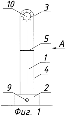 Если концевую часть 3 опоры расположить ниже основания 2 (фиг.6), то данную опору можно использовать в качестве поддерживающей конструкции для электролампы 10. В этом случае опора может быть использована в аварийно-спасательных осветительных установках при проведении поисково-спасательных работ в зоне ниже уровня основания 2 опоры.