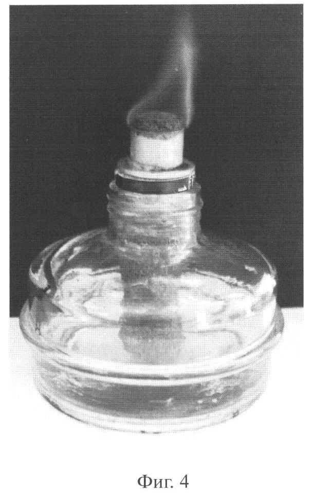 Устройство работает и испытывалось следующим образом: после заправки резервуара этиловым спиртом и двухминутной паузы на пропитывание фитиля зажигают пламя над фитилем (фиг.4), в зоне испарения спирта и перемешивания паров с воздухом. Высоту пламени и температуру регулируют выдвижением фитиля из держателя.