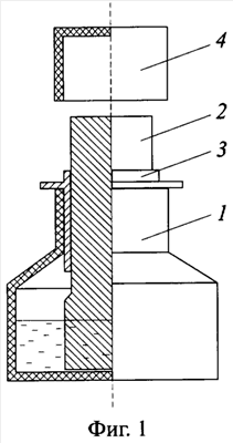 Фиг.1. Спиртовка лабораторная. Устройство в разрезе. 1 – резервуар для жидкого топлива, 2 – фитиль, 3 – держатель фитиля, 4 – защитный колпачок.