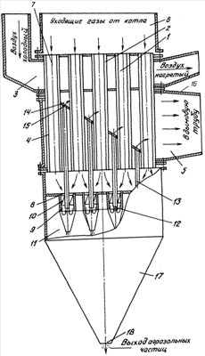 Утилизатор работает следующим образом. Уходящие газы от котла через газоподводящий патрубок 6 направляются в центральные каналы 7 тепловых труб 1, оставляя часть тепла последним. Нагнетаемый в воздуховод 3 воздух получает тепло, омывая конденсационные участки 2 тепловых труб 1. Выходящие из центральных каналов 7 газы поступают в нижнюю часть газохода 5, а оттуда – на входы 8 циклонных элементов 9. Проходя через закручиватели 10 циклонных элементов 9, газы очищаются от твердых аэрозольных частиц, ссыпающихся из циклонных элементов 9 в бункер 17 батарейного циклона 11, оттуда они по мере накопления удаляются через отверстие 18. Очищенные от твердых аэрозольных частиц газы с выходов 12 циклонных элементов 9 поступают в патрубки 13, размещенные в газоходе 5 между испарительными участками 4 тепловых труб 1, выходят из отверстий 15 перегородки 14 и, омывая испарительные участки 4 тепловых труб 1, нагревая их, направляются в выходной патрубок 16 газохода 5 примерно с одинаковыми скоростями. При этом не происходит выпадения аэрозольных легких твердых частиц (пыли) в газоходе 5, так как эти частицы уносятся потоком газа в дымовую трубу.