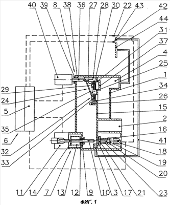 Толкатель 36, имеющий возможность продольного перемещения и соединенный с выключателем 24 с силовым замыканием, выступает из корпуса 1, в котором одновременно имеется для него опора 38. Посредством, например, кольца 39 круглого сечения обеспечивается необходимая герметизация для исключения выхода газа наружу. Толкатель 36 своим обращенным к выключателю 24 концом соединен с блоком 40 привода, который подробно не описывается, так как является известным для специалистов. Управление блоком 40 привода производится с пульта 6 дистанционного управления посредством электронного устройства 5 управления.