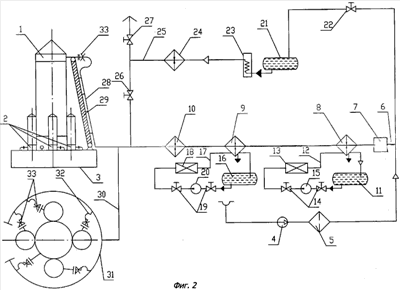 В результате получают воздух при температуре 2,5°С с температурой точки росы минус 25°С. Нагрев воздуха до требуемой температуры производят в электронагревателе воздуха 10 и по трубопроводу 28 подают его в космический объект 1, а по трубопроводу 30 в коллектор 31, из которого по трубопроводам 32 подают в отсеки 2 ракетоносителя. Размеры расходных шайб 33 устанавливают в зависимости от требуемой величины расхода газа (воздуха или азота) в космический объект 1 и в каждый отсек 2 ракетоносителя.