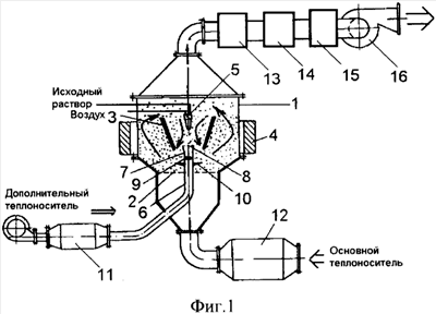 Установка для сушки растворов с инертной насадкой содержит корпус 1 (фиг.1) с газораспределительной решеткой 2, внутреннюю камеру 3 с поверхностями нагрева, форсунку 5 для распыления раствора. К нижней части внутренней камеры подведена труба 6, имеющая на выходе расширяющееся сопло 7 с газораспределительной решеткой 8 и снабженная радиальными отверстиями 9, под которыми расположен отражатель 10. Установка работает под разрежением, создаваемым вентилятором 16. Нагрев основного воздуха производится калорифером 12. Подвод дополнительного теплоносителя к трубе 6 производится автономно при помощи вентилятора через калорифер 11. На наружной поверхности корпуса размещен индукционный подогреватель 4. Внутрь камеры засыпают инертные тела кубической, призматической, сферической формы, которые изготавливают, например, из фторопласта (габаритные размеры тел в поперечнике порядка 4 мм при высоте рабочей камеры 500 мм).