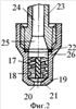 Центробежная форсунка (фиг.2) состоит из корпуса 19, внутри которого расположен шнек 17, запрессованный в корпус 19. Внешняя поверхность шнека 17 представляет собой винтовую канавку с правой (или левой) нарезкой. Внутри шнека 17 выполнено отверстие 18 с левой (или правой) винтовой нарезкой. В днище корпуса 19 выполнено дроссельное отверстие 20, ось которого совпадает с осью отверстия 18 в шнеке 17. Между нижним торцом шнека 17 и срезом дроссельного отверстия 20 расположена коническая камера смешения 21. Подача раствора (жидкости) осуществляется через штуцер 23, закрепленный в верхней части корпуса 19, через герметизирующую прокладку 22. Внутри штуцера 23 выполнено цилиндрическое отверстие 24, переходящее в диффузор 25, который соединен с цилиндрической камерой 26, выполненной в корпусе 19, в которую запрессован шнек 17.