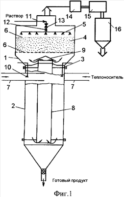 Недостаток прототипа – сравнительно невысокая производительность сушки конечного продукта из-за недостаточно высокой степени распыла растворов.