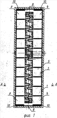 Обжиг кирпича осуществляется в кольцевой печи 1. Пакеты кирпича 2 расположены внутри обжигового канала 3, который перекрывается огнеупорным сводом 4. В зазорах между пакетами кирпича 2 расположены горелки 5 инжекционного типа, которые конструктивно находятся в нишах пода 6 печи 1. Ниши перекрыты огнеупорным материалом 7, имеющим отверстия для установки горелок 5. Обжиговые каналы 3 соединены по краям каналами меньшего сечения 8, предназначенными для передачи теплоносителя из одного обжигового канала 3 печи 1 в другой. Угловые камеры 9 печи снабжены торцевыми горелками 10 инжекционного типа.