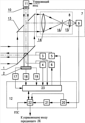 Вычислительно-управляющий блок 12 выполнен из последовательно соединенных селектора цели 20, вход которого подключен к выходу ФПУ 9, и анализатора отраженного лазерного излучения 21, выход которого и второй выход селектора цели 20 подключены к входам управляющего устройства 22, подключенного через контроллер 23 к входам приводов 5, 6 головного зеркала 1, к выходам датчиков углового положения 3, 4 и датчиков угловой скорости 17, 18, 19 и имеющего выход для подключения к управляющему входу передающего лазерного канала 11. Один из входов управляющего устройства 22 подключен к внешней системе целеуказания, например РЛС или широкоугольному пеленгатору (на чертеже не показаны). Селектор цели 20 и анализатор отраженного лазерного излучения 21 могут быть выполнены на базе сигнальных процессоров TMS320C6202 фирмы Texas Instrument, a управляющее устройство 22 может быть выполнено на базе микропроцессорного модуля формата РС/104 + СММ 17686 GX300-128 фирмы RTD.