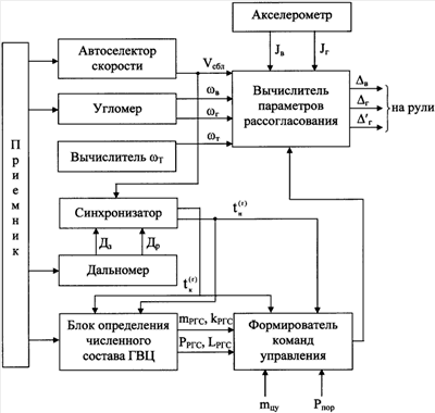 Способ формирования сигнала управления ракетой осуществляется следующим образом. Радиолокационный сигнал, отраженный от элементов ГВЦ, летящих в плотной группе и находящихся в главном луче ДНА РГС, с выхода приемника РГС поступает на входы входящих в состав РГС следующих измерителей параметров взаимного перемещения ракеты и цели: автоселектор скорости – для измерения скорости сближения Vсбл ракеты с ГВЦ; угломер – для измерения угловых скоростей линий визирования «ракета – цель» в вертикальной в и горизонтальной г плоскостях; дальномер – для измерения дальности до цели, в том числе дальности захвата Дз цели в РГС ракеты и дальности разрешения Дp целей, определяемой шириной ДНА , как Др= lТ/ , а также в блок определения численного состава ГВЦ – для определения максимального количества разрешаемых по доплеровской частоте целей в группе (mРГС (r) или kРГС (r)) и вероятности правильной оценки максимального количества разрешаемых по доплеровской частоте целей в группе (РРГС (r) или LРГС (r)) на каждом r-ом этапе наведения ракеты (r=1, …, R). В вычислителе параметров рассогласования на основе измеренных значений Vсбл, в и г, вычисленной в соответствии с выражением т= fф/2 lт требуемой угловой скорости вращения линии визирования «ракета – цель» в горизонтальной плоскости для обеспечения требуемого линейного разрешения целей в горизонтальной плоскости lТ, а также значений собственных ускорений ракеты в вертикальной Jв и горизонтальной Jг плоскостях, формируемых на выходе акселерометра, осуществляется вычисление параметра рассогласования в вертикальной плоскости с дальности захвата Дз цели РГС на сопровождение до встречи ракеты с целью в соответствии с выражением (1) и в горизонтальной плоскости с дальности Дз до дальности Др в соответствии с выражением (2) или (3) в зависимости от ситуации относительно количества разрешаемых по доплеровской частоте целей в группе в РГС ракеты на каждом предыдущем r-1 этапе наведения ракеты, и с дальности разрешения целей Др до встречи ракеты с целью в соответствии с выражением (2). Вычисленные значения параметров рассогласования в, г и ‘г поступают на соответствующие рули ракеты для управления ею в вертикальной и горизонтальной плоскостях.