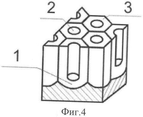 На фиг.4. изображено схематическое изображение структуры пористого оксида алюминия, где 1 – барьерный слой оксида алюминия, 2 – пора, 3 – оксидная ячейка.