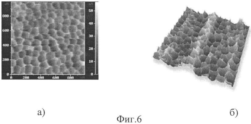 На основе метода атомной силовой микроскопии в полуконтактном режиме была исследована топография нанорельефной поверхности алюминия с использованием каждого из трех типов кантилеверов. С использованием первых двух типов кантилеверов было получено 3-х мерное изображение поверхности алюминия, согласующееся с известными данными (см. фиг.5). С использованием кантилеверов 3-го типа впервые на основе АСМ было получено изображение структуры пористого оксида, принципиально отличающееся от известных (см. фиг.6). Выявленная разница в полученных изображениях поверхности структуры обусловлена следующим. При измерениях морфологии поверхности на основе АСМ характерно паразитное явление конволюции, часто приводящее к искажению истинной картины рельефа поверхности. Суть явления в том, что каждая точка данных на получаемом изображении исследуемой рельефной поверхности представляет собой пространственную свертку формы острия иглы кантилевера и формы исследуемого объекта. Получаемая картина поверхности вместо изображения локальных частиц с размером, меньшим радиуса кривизны острия иглы кантилевера, содержит изображение острия иглы. С использованием кантилеверов 3-го типа явление конволюции удалось преодолеть и получить изображение, в максимальной степени приближенное к истинному. Из результатов исследования было выявлено, что структура реальных элементарных ячеек пористого оксида алюминия отличается от идеальных тем, что в узловых местах соединения верхних кромок стенок трех ячеек различных ячеек наблюдаются острия, радиус кривизны вершины которых находится в диапозоне от 1 до 3 нм (см. фиг.3) и которые не могли быть зафиксированы с использованием традиционных кантилеверов.