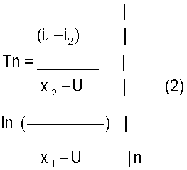 В соответствии с уравнением (2) в этом варианте выполнения способа определяют первую разницу между первым значением данных хi1 из представляющей аномалию группы DSA данных и определяемым в данный момент средним значением U индуцированного в протекающей среде напряжения, и вторую разницу между вторым значением данных хi2 из представляющей аномалию группы DSA данных и определяемым в данный момент средним значением U индуцированного в протекающей среде напряжения. Из определяемого отношения первой и второй разницы затем определяют в цифровом виде натуральный логарифм, с помощью которого нормируют образованную ранее разницу между значениями времени, соответственно показателями i1, i2.