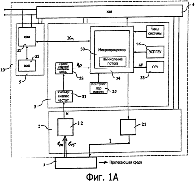 Кроме того, согласно предпочтительному варианту выполнения изобретения, вычислительная схема 3 содержит выполненный в виде отдельной частичной схемы контроллер 35 памяти, который связан с микропроцессором 30, например, через внутреннюю шину передачи данных и служит для управления памятью 33, в частности, выборкой цифрового измерительного сигнала uD и созданием последовательности AF считывания, и тем самым для разгрузки микропроцессора 30. Контроллер 35 памяти предпочтительно реализован в программируемой функциональной памяти, например, PAL (программируемая матричная логика) или FPGA (вентильная матрица, программируемая пользователем). Однако, при необходимости, контроллер 35 памяти может быть реализован также с помощью микропроцессора 30 или же с помощью дополнительного микропроцессора (не изображен) и выполняемых в нем программ вычисления. С помощью контроллера 35 памяти можно, например, также реализовать обычное для таких расходомеров образование среднего значения или усредненного значения для нескольких последовательностей считывания.