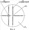 Линза 22 расположена на центральной оси диафрагмы 20. Линза 21 установлена со смещением и находится между диафрагмой 20 и линзой 22 на оси отверстия диафрагмы 20. Весь оптический узел 14 может вращаться вокруг оси, проходящей через центр диафрагмы 20 и центр линзы 22. Ход лучей между линзами 21 и 22 близок к параллельному или параллельный. Приемник лучистой энергии 15 расположен в задней фокальной плоскости линзы 22 или со смещением относительно упомянутой задней фокальной плоскости вдоль оси линзы 22. Передняя фокальная плоскость линзы 21 расположена в плоскости склейки световодов 18 и прозрачной плоскопараллельной пластины 19 или со смещением относительно этой плоскости вдоль оптической оси линзы 22. Сетка 4 (фиг.3) выполнена в виде прозрачных участков на непрозрачном фоне. Прозрачные участки получены на поверхности стеклянной пластины методом фотоосаждения в вакууме и выполнены в виде шести биссекторов 23, круга 24 и пяти кругов 25. Три биссектора расположены на центральных осях сетки, равноудалены от ее центра и образуют первое «неполное перекрестие». Центр первого перекрестия совпадает с центром сетки. Второе «неполное перекрестие» образовано четвертым и пятым биссекторами, лежащими на прямой, параллельной центральной оси, на которой находятся два биссектора из первых трех, и пересекающей свободную полуось, проходящую через центр, расположенными по обе стороны от центра, и последним, шестым биссектором, лежащим на центральной оси, перпендикулярной вышеуказанной прямой, и максимально удаленным от первого биссектора. Точка пересечения центральной оси с прямой, на которой расположены четвертый и пятый биссекторы, называется центром второго «неполного» перекрестия. Последние три биссектора также равноудалены от центра своего перекрестия. При этом шестой биссектор, входящий в состав второго «неполного» перекрестия, короче первых пяти. В центре первого «неполного» перекрестия выполнен прозрачный участок 24 в форме круга диаметром 0,015 мм. В центре второго «неполного» перекрестия выполнен прозрачный участок 25 в форме круга диаметром 0,04 мм, а на расстоянии 1 мм от него равноудалены еще четыре прозрачных участка, также выполненные в виде кругов диаметром 0,04 мм. Данное взаиморасположение прозрачных участков, выполненных в виде круга 24 и кругов 25, имитирует цель. Отверстия диафрагмы 16 выполнены совпадающими по размеру и взаиморасположению с прозрачными участками 24 и 25, выполненными в виде кругов и расположенными на сетке 4. На диафрагме 16 выполнены пазы, совпадающие по размеру и взаиморасположению с биссекторами 23 сетки 4.