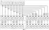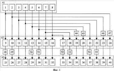 На схеме первый триггер 1 соединен с девятым триггером 9 и через четвертый инвертор 47 с двадцать четвертым триггером 24. Второй триггер 2 соединен с десятым триггером 10 и через третий инвертор 46 с двадцать третьим триггером 23. Третий триггер 3 соединен с одиннадцатым 11 и с двадцать вторым триггерами 22. Четвертый триггер 4 соединен с двенадцатым 12 и двадцать первым триггерами 21. Пятый триггер 5 соединен с тринадцатым триггером 13 и через второй инвертор 45 с двадцатым триггером 20. Шестой триггер 6 соединен с четырнадцатым триггером 14 и через первый инвертор 44 с девятнадцатым триггером 19. Седьмой триггер 7 соединен с пятнадцатым 15 и с восемнадцатым 18 триггерами. Восьмой триггер 8 соединен с шестнадцатым 16 и с семнадцатым 17 триггерами. Выход девятого триггера 9 через пятый инвертор 48 соединен с двадцать пятым 25 триггером. Выход десятого 10 триггера через шестой инвертор 49 соединен с двадцать шестым триггером 26. Выход одиннадцатого триггера 11 соединен с двадцать седьмым триггером 27. Выход двенадцатого триггера 12 соединен с двадцать восьмым триггером 28. Выход тринадцатого триггера 13 через седьмой инвертор 50 соединен с двадцать девятым триггером 29. Выход четырнадцатого триггера 14 через седьмой инвертор 51 соединен с тридцатым триггером 30. Выход пятнадцатого триггера 15 соединен с тридцать первым триггером 31. Выход шестнадцатого триггера 16 соединен с тридцать вторым триггером 32. Выход семнадцатого триггера 17 через девятый инвертор 52 соединен с тридцать третьим триггером 33. Выход восемнадцатого триггера 18 через десятый инвертор 53 соединен с тридцать четвертым триггером 34. Выход девятнадцатого триггера 19 соединен с тридцать пятым триггером 35. Выход двадцатого триггера 20 соединен с тридцать шестым триггером 36. Выход двадцать первого триггера 21 через одиннадцатый инвертор 54 соединен с тридцать седьмым триггером 37. Выход двадцать второго триггера 22 через двенадцатый инвертор 55 соединен с тридцать восьмым триггером 38. Выход двадцать третьего триггера 23 соединен с тридцать девятым триггером 39. Выход двадцать четвертого триггера 24 соединен с сороковым триггером 40.