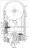 На фиг.3 схематически представлено решение, с помощью которого уменьшается этот эффект затенения или он вообще может быть исключен при соответствующих параметрах измерительной головки. Согласно изобретению вместо окна 29 предусмотрена призма 52 с зеркальной поверхностью 53. В этом варианте осуществления изобретения измерительные лучи выходят и входят в измерительную головку 8 не в радиальном направлении, а в основном тангенциально. Если призма 52 рассчитана так, что расстояние 54 внутреннего ограничения 55 пучка измерительных лучей 56 соответствует по меньшей мере радиусу основания 24 опорного кронштейна 21, 22, 24 или поворотного диска 45, не возникает какого-либо эффекта затенения. Когда поворотный диск 45 опорного кронштейна 21, 22, 24 с измерительной головкой 8 повернут на 180°, призма 52 и пучок измерительных лучей 56 занимают положение, показанное штриховой линией (52‘ соответственно 56‘). С помощью такого модифицированного измерительного устройства может проводиться контроль экстремально высоконагруженных зон вокруг патрубка 2 для загрузки и выгрузки.