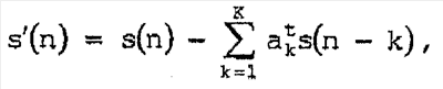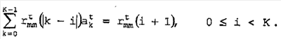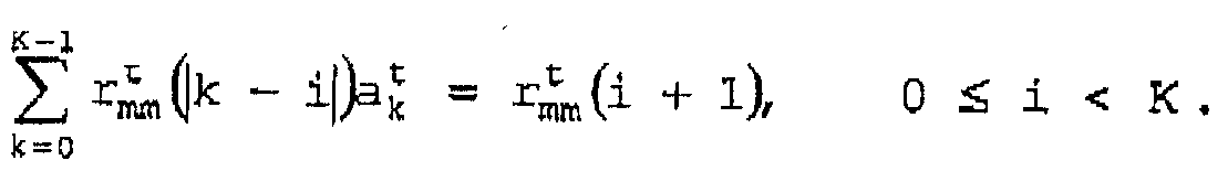 в котором зависимость от t, в свою очередь, предназначена для иллюстрации того, что пороговое значение М(f) маскирования изменяется для разных аудиоблоков. При выполнении предварительного фильтра 30 в форме адаптивного фильтра, указанной выше, коэффициенты ak t фильтра будут получены следующим образом: обратное дискретное преобразование Фурье |M(f, t)|2 по частоте для блока в момент времени t приводит к получению целевой функции автокорреляции rt mn(i). Затем ak t получают путем решения линейной системы уравнений: