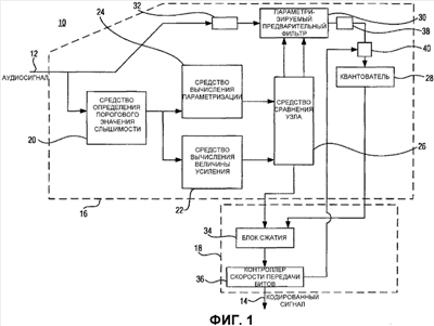 Аудиокодер 10 по Фиг.1 разделен на часть 16 уменьшения несущественного звука и часть 18 уменьшения избыточности. Часть 16 уменьшения несущественного звука включает в себя средство 20 определения порогового значения слышимости, средство 22 вычисления величины усиления, средство 24 вычисления параметризации, средство 26 сравнения узла, квантователь 28 и параметризируемый предварительный фильтр 30, а также выходной буфер 32 FIFO («первым прибыл, первым обслужен»), буфер или запоминающее устройство 38 и умножитель или средство 40 умножения. Часть 18 уменьшения избыточности включает в себя блок 34 сжатия и контроллер 36 скорости передачи битов.