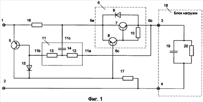 Шина положительного потенциала входного напряжения 1 соединена с эмиттером p-n-p транзистора 5 и, через датчик тока 16, с входом (6а) электронного ключа 6 и общей точкой (11с) апериодического звена 11. Выход (6b) электронного ключа 6 соединен с шиной положительного потенциала выходного напряжения 3 (выход устройства) и с входом (11а) апериодического звена 11. Выход (11b) апериодического звена 11 соединен с базой p-n-p транзистора 5 и с анодом диода 15. Катод диода 15, вход управления (6с) электронного ключа 6 и коллектор p-n-p транзистора 5 соединены через резистор 17 с шиной отрицательного потенциала входного напряжения 2 и шиной отрицательного потенциала выходного напряжения 4 («общая точка» входа и выхода устройства).