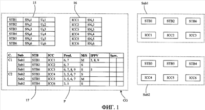 Вторая таблица 16 содержит список всех модулей ICC защиты и их уникальные идентификационные номера SNs. Третья таблица 17 содержит список контрактов С1, С2… подписки и подписчиков Sub1, Sub2…, каждый из которых связан, с одной стороны, с соответствующим декодером STB, а с другой стороны, с модулем ICC защиты. Эта таблица также содержит список продуктов Р, приобретенных подписчиком, и указание на функцию ведущего (М) или ведомого (S), сущность которой объяснена ниже. Таблица 17 также может использоваться для хранения других данных, называемых служебными данными, что также разъяснено ниже. Продукты Р, т.е., в частности, программы, просмотр которых разрешен данному подписчику, могут быть связаны с контрактами подписки или с модулями защиты. Это означает, что продукты могут быть одинаковыми для всех модулей защиты данного подписчика или, напротив, могут быть различными для разных модулей. Следовательно, можно, например, ограничить круг продуктов, доступных для конкретного набора из декодера и модуля защиты. Специалисту в данной области очевидно, что продукты могут представлять собой каналы трансляции, пакеты из нескольких каналов или отдельные программы. Этап, включающий поиск данных и создание связей в базе данных, обозначен на фиг.2а номером 23.