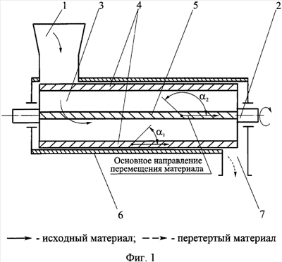 Применение бичей 5, имеющих рифы, расположенные под тупым углом 2 к основному направлению перемещения материала, позволяет осуществлять его перемещение в сторону загрузочной горловины 1, что увеличивает время пребывания материала в терочном устройстве и интенсифицирует процесс вытирания семян.