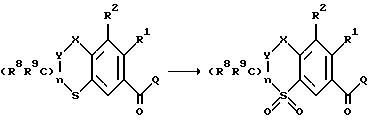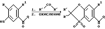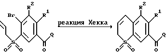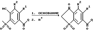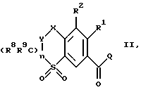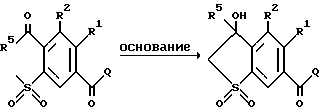 ![]() где R1 и R2 обозначают независимо друг от друга H или A; X обозначает CR4R5, C=Z или O; Y обозначает CR6R7; Z обозначает O или CH2, R4, R5, R6 или R7 обозначают независимо друг от друга H, A, OH или OA, или R5 и R6, или R7 и R8 обозначают вместе связь, причем в каждой молекуле может появляться максимально только одна подобная связь, или R4 и R5 обозначают вместе O-(CH2)2-O или O-(CH2)3-O, или R8 и R9 обозначают независимо друг от друга H или A; A обозначает алкил с 1 – 6 C-атомами; n обозначает 0 или 1, и их физиологически приемлемые соли. 2. Соединение по п.1, представляющие собой: (a) 1,1-диоксид N-диаминометилен-2,3-дигидро-3-гидрокси-1-бензотиофен-6-карбоксамида; (b) 1,1-диоксид N-диаминометилен-2,3-дигидро-3-гидрокси-5-метил-1-бензотиофен-6-карбоксамида; (c) 1,1-диоксид N-диаминометилен-2,3-дигидро-3-гидрокси-3,5-диметил-1-бензотиофен-6-карбоксамида; (d) 1,1-диоксид N-диаминометилен-2,3-дигидро-3-гидрокси-3-метокси-3,5-диметил-1-бензотиофен-6-карбоксамида; (e) 1,1-диоксид N-диаминометилен-2,3-дигидро-3,5-диметил-1-бензотиофен-6-карбоксамида; (f) 1,1-диоксид N-диаминометилен-2,3-дигидро-3-гидрокси-3,5-диметил-1-бензотиофен-6-карбоксамида. 3. Способ получения циклических сульфонов формулы I по п.1 и их солей, отличающийся тем, что соединение формулы II ![]() где R1, R2, R8, R9, X, Y и n имеют значения, указанные в п.1; Q обозначает Cl, Br, OA, где A имеет значение, указанное в п.1, подвергают взаимодействию с гуанидином, с последующим выделением основания формулы I или переводят его в соль действием кислоты. 4. Способ получения фармацевтических композиций, отличающийся тем, что соединение формулы I по п.1 и/или одну из его физиологически приемлемых солей переводят в подходящую дозировочную форму вместе, по меньшей мере, с одним твердым, жидким или полужидким носителем или вспомогательным веществом. 5. Фармацевтическая композиция, обладающая ингибирующей активностью в отношении Na+/H+ обмена, отличающаяся тем, что она содержит, по меньшей мере, одно соединение общей формулы I по п.1 и/или одну из его физиологически приемлемых солей. РИСУНКИ