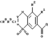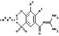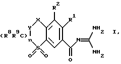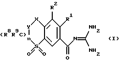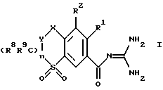 (57) Реферат: Изобретение относится к новым гетероциклическим конденсированным бензоилгуанидинам общей формулы I, где R1 и R2 обозначают независимо друг от друга Н или А; Х обозначает CR4R5; C=Z или O, Y обозначает CR6R7, Z обозначает О или CH2, R4, R5, R6 или R7 обозначают независимо друг от друга Н, А, ОН или ОА, или R5 и R6, или R7 и R8 обозначают вместе связь, причем в каждой молекуле может появляться максимально только одна подобная связь, или R4 и R5 обозначают вместе О-(CH2)2-O или О-(CH2)3-O, или R8 и R9 обозначают независимо друг от друга Н или А; А обозначает алкил с 1 – 6 С-атомами; n обозначает 0 или 1, и их физиологически приемлемые соли. Бензоилгуанидины формулы I являются ингибиторами клеточного Na+/H+-антиносителя и используются для получения лекарственных средств. Описывается также способ получения соединений формулы I, фармацевтическая композиция на их основе и способ ее получения. 4 с. и 1 з.п. ф-лы, 1 табл.