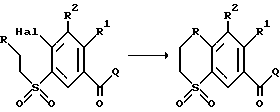 Изобретение относится к циклическим сульфонам формулы I ![]() где R1 и R2 обозначают соответственно независимо друг от друга H, A, CF3, CH2F, CHF2, C2F5, Hal, ОН, OA, NH2, NHA, NA2, NO2 или CN, X обозначает -CR4R5, C=Z, O, S, NH, NA или NR3, Y обозначает CR6R7, C=Z, O, NH, NA или NR3, Z обозначает O, S, NH, NA, NOH, NOA, CH2, CHA или CA2, R4, R5, R6 и R7 обозначают соответственно независимо друг от друга H, A, R3, Hal, ОН, OA, SH, SA, NH2, NHA или NA2, или же R5 и R6? или R7 и R8 обозначают соответственно вместе также связь, причем в каждой молекуле может появляться только одна подобная связь; R4 и R5 обозначают вместе также O-(CH2)2-O или O-(CH2)3-О, R8 и R9 обозначают соответственно независимо друг от друга H или A, A обозначает алкил с 1-6 C-атомами, Hal обозначает F, Cl, Br или I и R3 обозначает незамещенный или замещенный одно-, дву- или трехкратно A, OA, NH2, NHA, NA2, F, Cl, Br и/или CF3 фенил или бензил и n обозначает 0 или 1, и к их физиологически приемлемым солям. Задачей изобретения является поиск новых соединений с ценными свойствами, особенно такие, которые можно применять для изготовления лекарственных средств. Было найдено, что соединения формулы I и их физиологически приемлемые соли при хорошей переносимости имеют ценные фармакологические свойства. При новых соединениях речь идет об ингибиторах клеточного Na+H+-антиносителя, т. е. об активных веществах, которые тормозят механизм Na+H+-обмена клеток (Dusing и др., Med. Klin. 87, 378-384 (1992)) и представляют, следовательно, хорошие антиаритмические средства, которые пригодны особенно для лечения аритмий, появляющихся как последствие гипоксии. Самым известным активным веществом группы ацилгуанидинов является амилорид. Однако это вещество проявляет, в первую очередь, понижающее кровяное давление и салуретическое действие, что нежелательно особенно при лечении нарушений сердечного ритма, в то время как антиаритмические свойства выражены лишь очень слабо. Бензоилгуанидины описаны, например, в патенте Германии DE 4404183. Однако описанные в уровне техники соединения значительно отличаются по структуре от заявленных соединений. Предметом изобретения являются соединения формулы I и их физиологически приемлемые соли. Вещества настоящей заявки согласно изобретению проявляют хорошее кардиозащитное действие и поэтому пригодны особенно для лечения инфаркта, профилактики инфаркта и для лечения стенокардии. Далее, вещества противодействуют всем патологическим гипоксическим и ишемическим поражениям, так что благодаря им можно лечить первично или вторично вызванные заболевания. Вещества с успехом применяются также для профилактики. На основании защитных действий этих веществ при патологических, гипоксических или ишемических ситуациях возникают при этом другие возможности применения при хирургических вмешательствах для защиты временно менее снабженных кровью органов, при трансплантациях органов для защиты взятых органов, при ангиопластических вмешательствах в сосуды или сердце, при ишемиях нервной системы, при терапии шоковых состояний и для предупредительного лечения эссенциальной гипертонии. Далее, соединения можно применять также как терапевтические средства при обусловленных пролиферацией клеток заболеваниях, как артериосклероз, диабетические поздние осложнения, опухолевые заболевания, фибромные заболевания, особенно легких, печени и почек, а также гипертрофии и гиперплазии органов. Кроме того, вещества использ