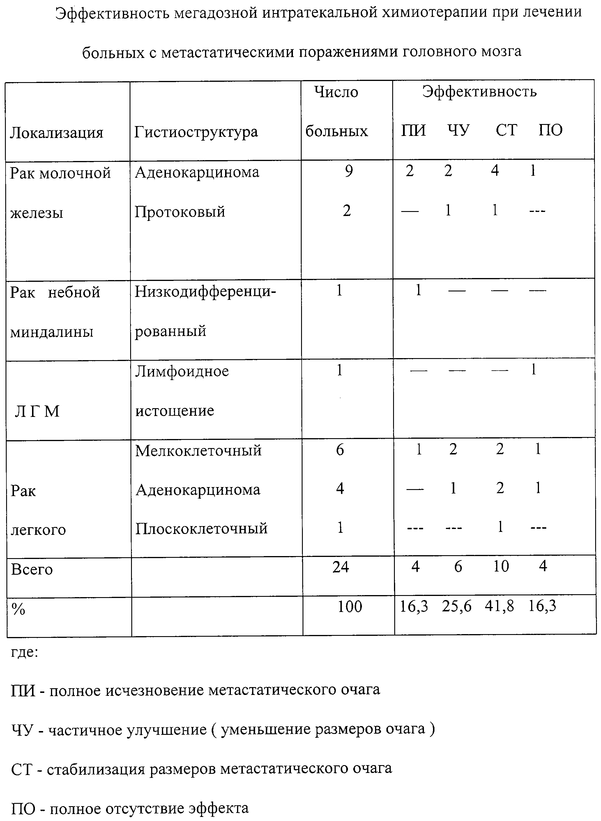 Изобретение относится к медицине, в частности к химиотерапии метастатических поражений головного мозга. Способ включает интратекальное введение метотрексата в количестве 1,2-2,5 мг на кг веса больного в сочетании с цитозаром в количестве 3-5 мг на кг веса и гидрокортизоном в количестве 125 мг с предварительной дегидратацией головного мозга и внутривенным введением церебролизина. Со второго дня после введения химиопрепаратов проводят 1-2 сеанса плазмафереза. Препараты вводят трехкратно с интервалом в 7 дней, в дальнейшем 1 раз в месяц трехкратно. Способ позволяет повысить эффективность лечения за счет снижения токсических осложнений химиотерапии. 2 з.п.ф-лы, 1 табл. Изобретение относится к медицине, в частности к химиотерапии метастатических поражений головного мозга. Известен способ химиотерапевтического воздействия на организм при интратекальном введении метотрексата в количестве 0,25 мг на кг веса (Методические рекомендации по химиотерапии злокачественных опухолей головного мозга. Утверждено бюро президиума Ученого Медицинского Совета Минздрава УССР 27 октября 1975, 12-13 с.). Недостатком способа является его невысокая эффективность. Известен способ химиотерапевтического воздействия при эндолюмбальном (интратекальном) введении метотрексата (А.П.Ромоданов, Ю.А.Зозуля, Ю.Д.Соснов. Метастатические опухоли головного мозга. – Киев: Здоровье, 1973, 172 с.). Недостатком способа является также его невысокая эффективность. Известен способ лечения нейролейкемии интратекальным введением метотрексата в дозе 12,5 мг/м2 (0,35 мг/кг веса) (Под ред. Н.И.Переводчиковой Противоопухолевая химиотерапия. Справочник, Москва, 1996, 28 с.). Известен способ лечения поражения оболочек мозга при лейкозе интратекально цитозаром в дозе 30-50 мг/м2 (1,5 мг/кг веса) один, два или три раза в неделю (А.М.Гарин, А.В.Хлебнов. Справочник практической химиотерапии опухолей, Москва, 1995, 59 с.). Известно лечение метастазов рака и меланом в головной мозг применением кортикостероидов (А.П.Ромоданов, Ю.А.Зозуля, Ю.Д.Соснов. Метастатические опухоли головного мозга. – Киев: Здоровье, 1973, 172 с.). Недостатком способов является также их невысокая эффективность. Задачей изобретения является удлиннение ремиссии опухолевого процесса в головном мозге и увеличение продолжительности и улучшение качества жизни больных. Задача решается тем, что в способе лечения метастатических поражений головного мозга, включающем химиотерапевтическое воздействие на организм при интратекальном (эндолюмбальном) введении, метотрексат в спинно-мозговой канал вводят в мегадозах 1,2-2,5 мг/кг веса тела в сочетании с цитозаром 3-5 мг/кг веса тела и гидрокортизоном в количестве 125 мг. Задача решается тем, что для профилактики острого отека мозга и, как следствие, судорог при мегадозном введении метотрексата и цитозара перед процедурой проводят лекарственную дегидратацию головного мозга с внутривенным введением церебролизина. Задача решается также тем, что для уменьшения общетоксического действия со 2 дня после введения химиопрепаратов проводят 1-2 сеанса плазмофереза. Задача решается также тем, что препараты вводят трехкратно с интервалом в 7 дней, в дальнейшем раз в месяц трехкратно. Установлено, что в способе лечения метастатических поражений головного мозга введением химиопрепаратов в ликвороносное русло (интратека