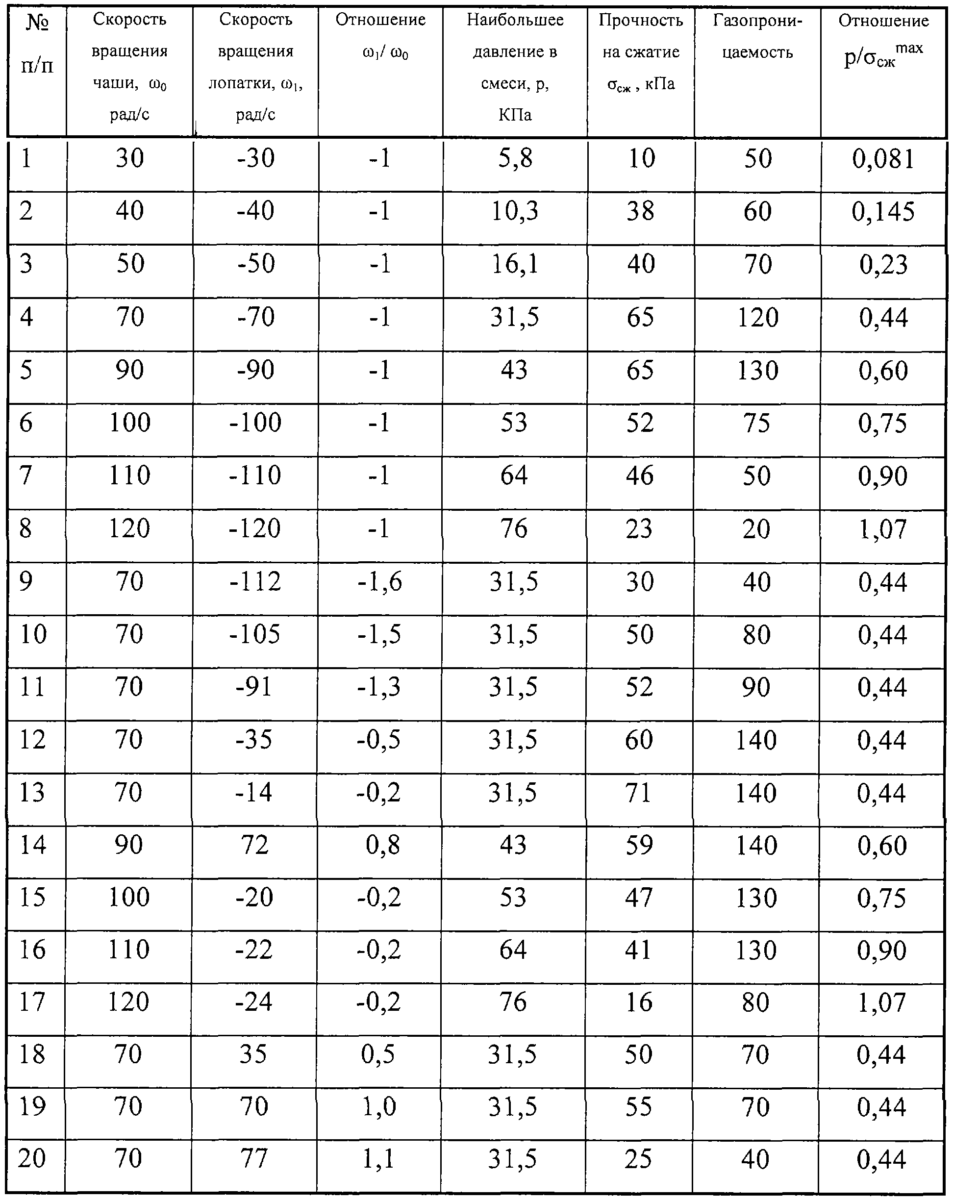 Изобретение относится к литейному производству. Ингредиенты смеси загружают во вращающуюся цилиндрическую чашу с вращающимися лопатками. Чашу вращают со скоростью, создающей давление в смеси, равное 0,14-0,9 от максимальной прочности смеси на сжатие. Лопатки вращают относительно чаши со скоростью, составляющей (-1,5) – (+1,0) от скорости вращения чаши. Такие параметры вращения обеспечивают получение смесей повышенного качества без абразивного износа зерен основы смеси и лопатки. 1 табл. Изобретение относится к области литейного производства и может быть использовано при приготовлении формовочных песчано-глинистых смесей. Известны способы приготовления формовочных песчано-глинистых смесей, при которых обработку ингредиентов производят в неподвижной цилиндрической чаше вращающимся ротором с катками, плужками и разрыхляющими элементами /1/. Существенным недостатком данных способов является недостаточное качество производимых смесей за счет отсутствия однородности смеси, так как из-за малой интенсивности обработки часть связующего неравномерно распределена по зернам основной массы. Из известных способов наиболее близким к заявляемому является способ приготовления формовочных песчано-глинистых смесей, при котором обработку ингредиентов производят во вращающейся цилиндрической чаше вращающимся ротором с лопатками, скорость вращения которых в 5-8 раз превышает скорость вращения чаши, т.е. приготовление смеси выполняется лопатками, а вращение чаши обеспечивает подачу следующих порций ингредиентов для обработки /2/. Существенным недостатком данного способа также является низкое качество производимых смесей ввиду недостаточной адгезионной связи между зернами основы и глиной и загрязнения их пылью зерновой основы и материала лопаток смесителя в результате их абразивной обработки. Технической задачей, которую решает предлагаемое изобретение, является повышение качества производимых песчано-глинистых смесей. Поставленная задача решается тем, что в предлагаемом способе приготовления формовочных песчано-глинистых смесей обработку ингредиентов производят во вращающейся цилиндрической чаше вращающимся ротором с лопаткой, при этом чашу вращают со скоростью, создающей давление в смеси, равное 0,14-0,9 от максимальной прочности смеси на сжатие, а лопатку относительно чаши вращают со скоростью, равной -1,5… +1,0 от скорости вращения чаши. Сущность предлагаемого технического решения заключается в том, что при вращении чаши со скоростью, создающей давление в смеси, равное 0,14-0,9 от максимальной прочности смеси на сжатие, сжатая смесь срезается лопаткой, в результате чего усиливается адгезионная связь между зернами основы и глиной, создается равномерное распределение связующего по объему смеси, обеспечивается одинаковая толщина пленки глины на каждом зерне, а вращение лопатки относительно чаши со скоростью, равной -1,5… +1,0 от скорости вращения чаши, позволяет получать смеси повышенного качества без абразивного износа зерен основы и лопатки. Вращение чаши со скоростью Способ осуществляют следующим образом. Приводят во вращение чашу и лопатку, при этом чашу вращают со скоростью, создающей давление в смеси, равное 0,14-0,9 от максимальной прочности смеси на сжатие, а лопатку вращают относительно чаши со скоростью равной -1,5… +1,0