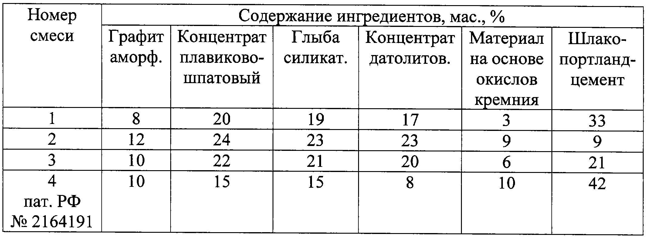 Шлакообразующая смесь для непрерывной разливки стали, преимущественно для начала разливки первой плавки, включающая углеродсодержащий материал, фторсодержащий материал, глыбу силикатную, концентрат датолитовый, материал на основе окислов кремния и цемент, отличающаяся тем, что ингредиенты смеси взяты в следующем соотношении, мас.%: Углеродсодержащий материал 8-12 Фторсодержащий материал 20-24 Глыба силикатная 19-23 Концентрат датолитовый 17-23 Материал на основе окислов кремния 3-9 Цемент Остальное |