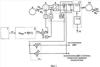 Устройство (фиг.1) содержит задатчик положения 1 топливоподающего органа с выходным сигналом h1, преобразователь 2 положения топливоподающего органа в сигнал задания угловой частоты вращения выходного вала двигателя внутреннего сгорания зад, сравнивающее устройство 3 с выходным сигналом  , равным разности зад и , ДВС 4, генератор переменного тока 5, выпрямитель 6, преобразователь 7 разности заданной и действительной угловых частот вращения выходного вала ДВС в соответствующий ток возбуждения генератора переменного тока, датчик 8 частоты и величины напряжения, включающий датчик частоты 8.1 напряжения на выходе генератора 5, датчик величины 8.1 напряжения на выходе выпрямителя 6, систему управления 9 током зарядки аккумулятора 10, систему управления электрическим двигателем 11, включающую силовой преобразователь 11.1 со своей системой управления 11.2, имеющей на входе сигнал h2 водителя, электрический двигатель 12, преобразователь 13 частоты напряжения на выходе генератора в сигнал угловой частоты вращения выходного вала ДВС , двухуровневый компаратор 14, преобразующий сигнал на его входе в команду на отключение ДВС или включение ДВС и системы управления током зарядки аккумулятора.