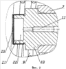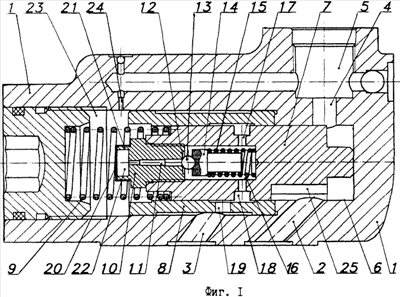 Заклапанная полость 16 предохранительного клапана 10 через радиальные каналы 17 соединена с кольцевой проточкой 18 на наружной поверхности золотника 7, которая через канал 19 соединяется со сливным каналом 3. На торце предохранительного клапана 10 перед дроссельным каналом 11 размещен фильтрующий элемент 20, закрепленный на торце кольцевого выступа 21, образованного вокруг входа в дроссельный канал 11 (см. фиг.2). Таким образом, перед дроссельным каналом 11 образована замкнутая полость 22.