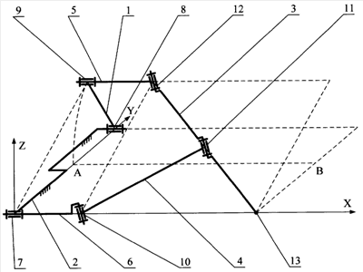 При выбранной ориентации осей шарниров 8, 9 и принятому функциональному назначению поводков 1 и 2 первой диады плоскость этой диады неподвижна в любом положении механизма. При выбранной ориентации осей шарниров 7, 9, осей шарниров 10, 11, 12 и принятом расположении промежуточных звеньев 5, 6 подвижная плоскость второй диады перпендикулярна плоскости первой диады в любом положении механизма.