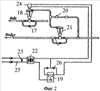 На фиг.2 представлен блок управления работой пневматических форсунок. Он содержит волосяной регулятор влажности 19, мембранные клапаны 18 и 21, запорные вентили 17, игольчатый дроссель 20 для регулирования давления сжатого воздуха перед мембранными клапанами, трансформатор напряжения 22, контрольные лампы 23 и 26, выключатель 25 и электропневматическое реле 24.