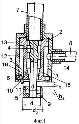 Внутри втулки 2, соосно ей, расположен кольцевой объемный резонатор 5, выполненный в виде чашки 9 с конической поверхностью 11. Чашка 9 запрессована на стержне диаметром d резонатора 5, а в его хвостовой части 4 расположены фиксирующие диски 12 и 13, выполненные в виде упругих лепестков, взаимодействующих с внутренней поверхностью втулки 14. В нижнем фланце 6 расположено по крайней мере одно сопло 10 под углом к оси резонатора 5, величина которого лежит в следующем интервале величин: 20°÷40°, причем продолжение оси сопла 10 лежит на окружности, находящейся в средней части конической поверхности 11 резонатора 5. На внутренней поверхности втулки 14 выполнены соосные коническое 15 и цилиндрическое 1 6 отверстия.