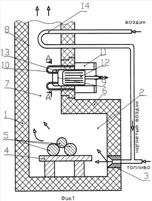 Известны устройства для использования тепла отходящих печных газов в теплообменнике (рекуператоре), установленном в газоотводящем тракте, на нагрев воздуха, поступающего в топливные горелки нагревательных печей [Немзер Г.Г. Теплотехнология кузнечно-прессового производства. – Л.: Машиностроение, 1988, с.208-210]. Эффективность использования тепла отходящих газов в рекуператорах не превышает 20-30%, ограничена предельной температурой нагрева воздуха для топливных горелок и не может использоваться при пуске и остановке пламенных печей.