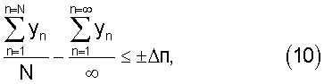 Данные выводы справедливы и для любой дискретной сходящейся последовательности, примером которой может служить ряд последовательных измерений на фиг.1. Причем для подобного ряда всегда можно определить количество измерений N, при котором погрешность определения уср не будет превышать заданной максимальной (предельной) величины п, т.е. выполняется условие