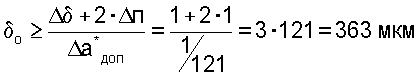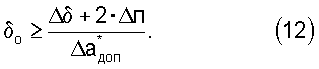 Кроме того, поскольку погрешность определения параметра аi зависит не только от величины приращения показаний измерительного прибора уi, но и от величины образцового перемещения o (уравнение 16), то его минимальную величину определяют исходя из допустимой погрешности п, заданной погрешности увеличения зазора на образцовую величину  , а также допустимой относительной погрешности параметра градуировочной характеристики а доп в соответствии с выражением (12).