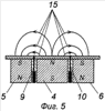 В предлагаемом устройстве для измерения скорости потока электропроводящей жидкости магнитная система содержит шесть постоянных магнитов 1,…,6, закрепленных в корпусе 11, выполненном из немагнитного металла, например титана (см. фиг.1, 2). Форма корпуса 11 может быть самой разнообразной в зависимости от конструкции прибора. На фиг.1-3 изображено устройство, магнитная система которого с электродами 7,…,10 выполнена в корпусе цилиндрической формы. Такая форма корпуса является технологичной как с точки зрения его изготовления, так и с точки зрения выполнения места установки его в прибор. Рабочая поверхность 12 корпуса образована покрытием 13 из диэлектрического материала, в котором выполнены отверстия для электродов 7,…,10. В качестве диэлектрического материала может быть использован эпоксидный компаунд. Под рабочей поверхностью 12 понимается поверхность, вдоль которой протекает поток электропроводящей жидкости. Рабочая поверхность 12 имеет преимущественно плоскую форму, но в общем случае может иметь и выпуклую форму.